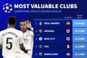 本赛季欧冠参赛球队身价排名: